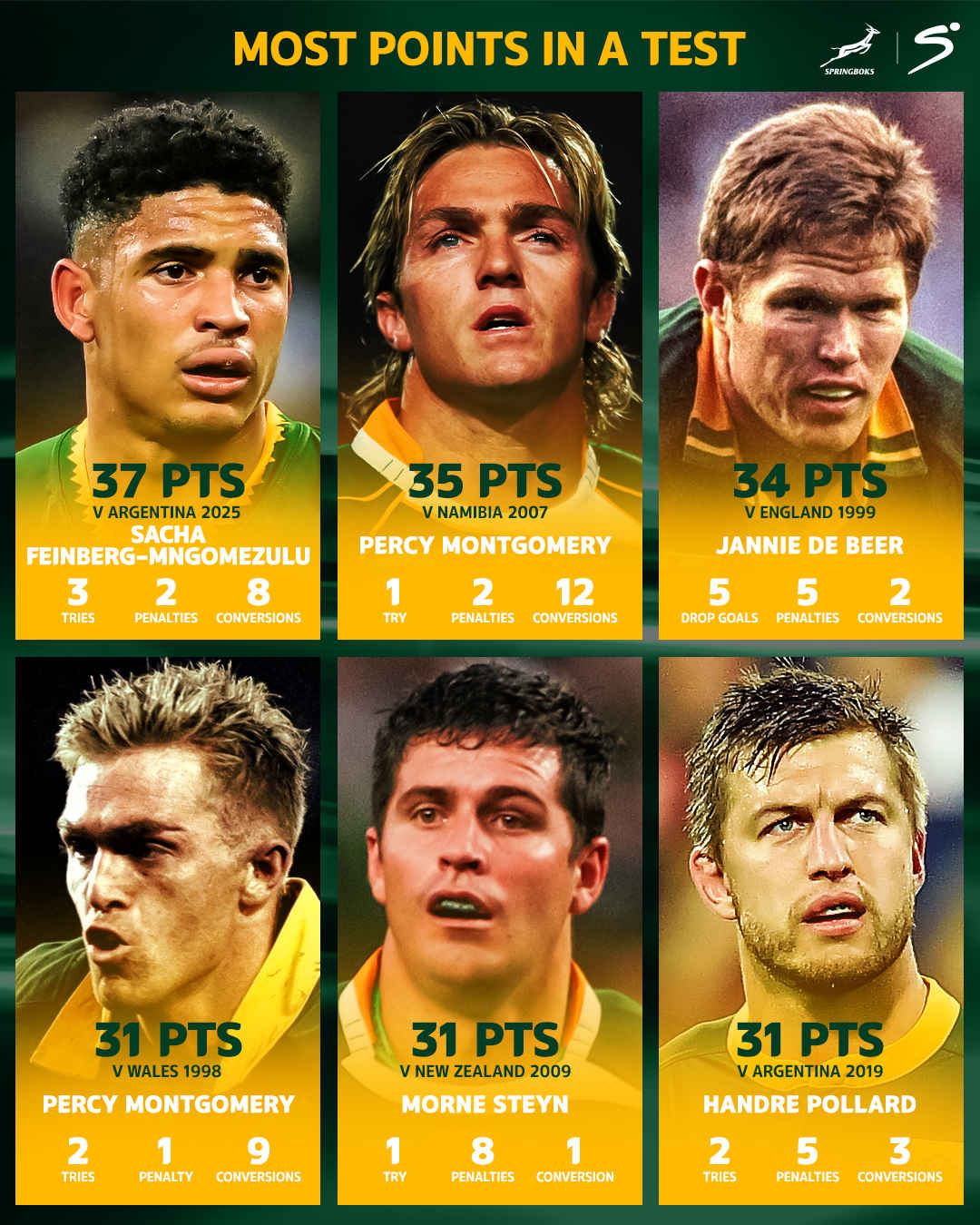After Sacha Feinberg-Mngomezulu's absolute domination of the match against Argentina on Saturday, in which he scored a new Springbok record of 37 points in a match, we thought we'd take a look at the previous SA records.