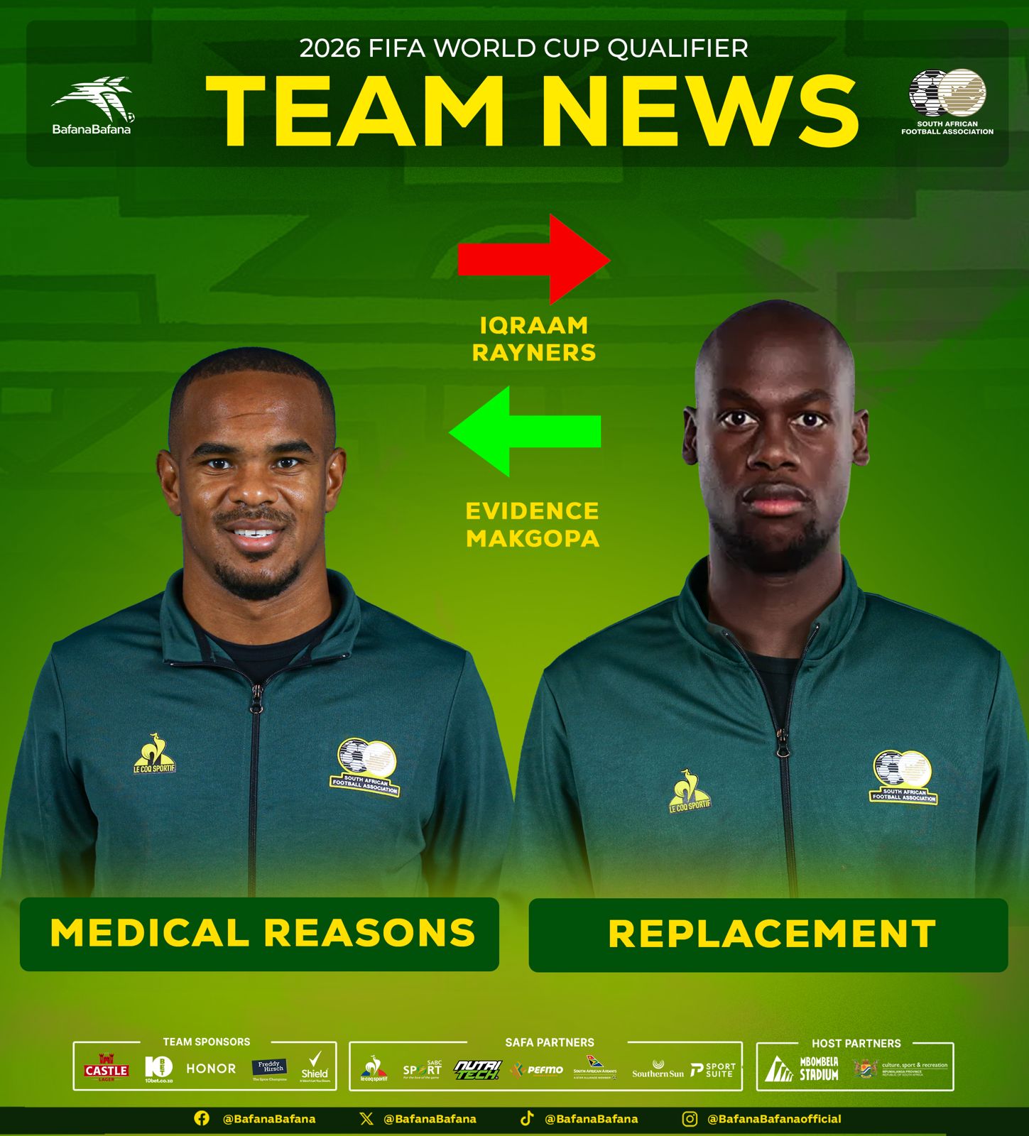 Meanwhile, Iqraam Rayners has been withdrawn from the Bafana Bafana camp due to medical reasons. He was released back to his club on Tuesday morning. Evidence Makgopa has been called up as his replacement.