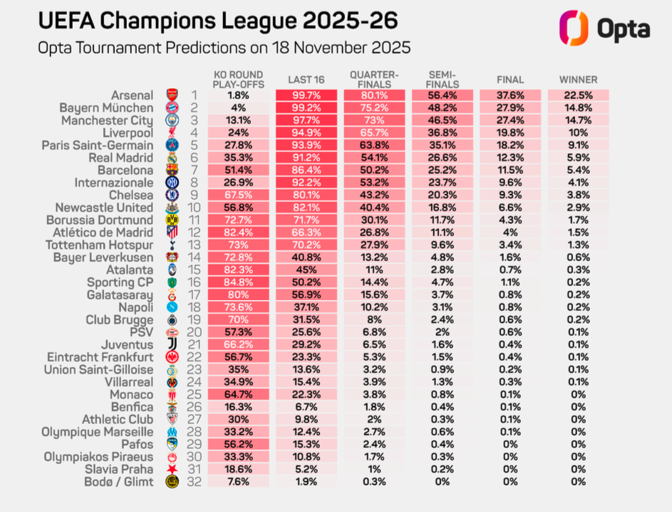 English Dominance: Five English clubs have an 80 per cent+ chance of qualifying, with Arsenal spearheading the charge.